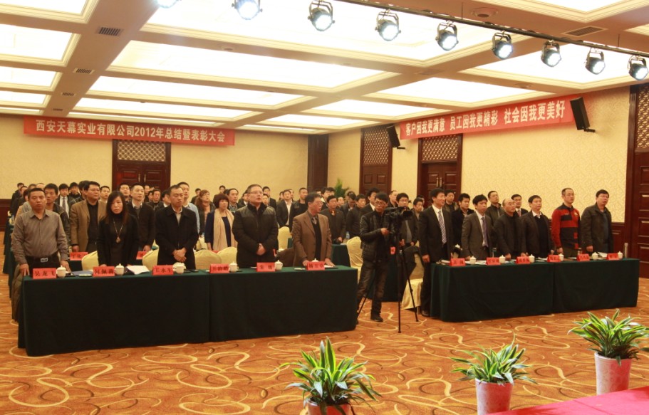 2013年3月1日,西安天幕實(shí)業(yè)有限公司“2012年總結(jié)暨表彰大會(huì)”在海升酒店舉行,參加這次大會(huì)的主要領(lǐng)導(dǎo)有公司各部門(mén)領(lǐng)導(dǎo)、各分公司領(lǐng)導(dǎo)及特邀嘉賓,會(huì)上由總公司和各個(gè)分公司及各個(gè)部門(mén)做工作報(bào)告到員工代表講話。企業(yè)并對(duì)在2012年作出突出貢獻(xiàn)的部門(mén)及個(gè)人頒發(fā)了優(yōu)秀部門(mén)和先進(jìn)個(gè)人獎(jiǎng)項(xiàng),會(huì)場(chǎng)氣氛莊重而熱烈。