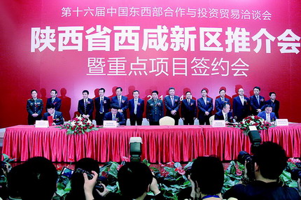 在2011年10月份的陜港澳經(jīng)貿(mào)合作活動(dòng)中,西咸新區(qū)簽約總額近800億元,涉及基本建設(shè)、生態(tài)建設(shè)、產(chǎn)業(yè)項(xiàng)目、商業(yè)地產(chǎn)和文化產(chǎn)業(yè)等多個(gè)領(lǐng)域,占全省簽約額的80%,穩(wěn)坐活動(dòng)的“頭把交椅”,充分展示了西咸新區(qū)作為深入推進(jìn)西部省份之間、東中西部之間大流通、大融通,實(shí)現(xiàn)西部大開(kāi)發(fā)縱深橫向推進(jìn)的重要門(mén)戶(hù)所具有的投資吸引力和凝聚力,實(shí)現(xiàn)了西咸新區(qū)在世界范圍內(nèi)的第一次精彩亮相。