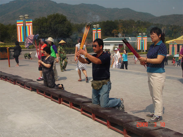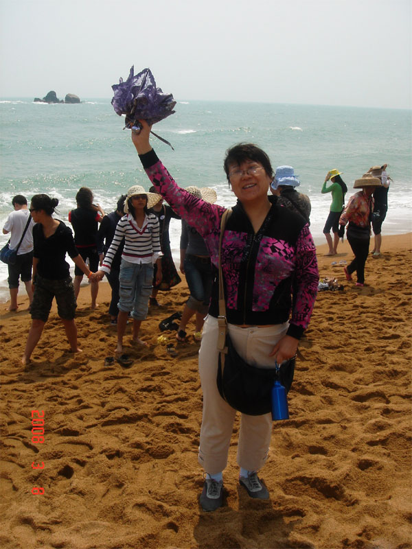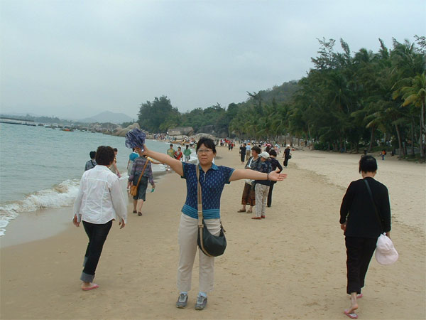 接下來的幾天我們在導(dǎo)游的帶領(lǐng)下,游覽了分界洲、瓊海、大東海、亞龍灣、萬泉河、五指山和天涯海角等風(fēng)景區(qū),海南景色優(yōu)美,環(huán)境清新,游人也很文明,生怕玷污了自己內(nèi)心的凈土,尤其是在“天涯海角”,那里聚集了很多游客,有親密的情侶、有攜手的老伴、有相擁的中年人、有提鞋嬉戲的孩童。人們在此處留影,光腳到沙灘上行走,海水拍打著腳面,暖暖的,軟軟的,麻酥酥的,沁人心脾。從腳到全身的每個細(xì)胞都游離在舒適、輕松、溫暖和諧的感覺中,近看,有一對年輕人漫步跑入海灘,追逐著海浪,海浪突然急轉(zhuǎn)身想擁抱他們,他們急速回跑,但仍然被澆個梨花帶雨。向遠(yuǎn)處看,海水很靜,很藍(lán),就象熟睡中的寶貝,沒有咆哮,沒有狂燥,偶爾吹來的海風(fēng),好象大海傾訴的心聲。