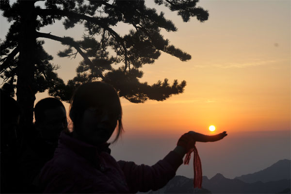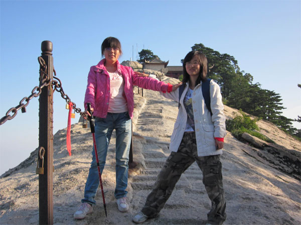 看完日出之后天已經(jīng)大亮,原本驚險的華山毫無遮攔的展現(xiàn)在我們腳下,美麗的風(fēng)光已讓人目眩不止、震驚不已,勢若天梯的千尺幢,鬼斧天成的老君犁溝……一座座雄奇險峻的山峰,就像一把把利劍直插云霄,牽著朦朧的煙霧在山顛彌漫。山顛上的小亭忽隱忽現(xiàn),仿佛“霧中仙閣”!隨后我們相繼游玩了其他各峰,包括“華山論劍” 的北峰和俗稱“華山之巔”的南峰;那高秀云表的天外之峰,那紅色盡染的圣奇靈山,真讓人心曠神怡,眉宇大展……還有仰天池,我們每個人都在此處合影留念。