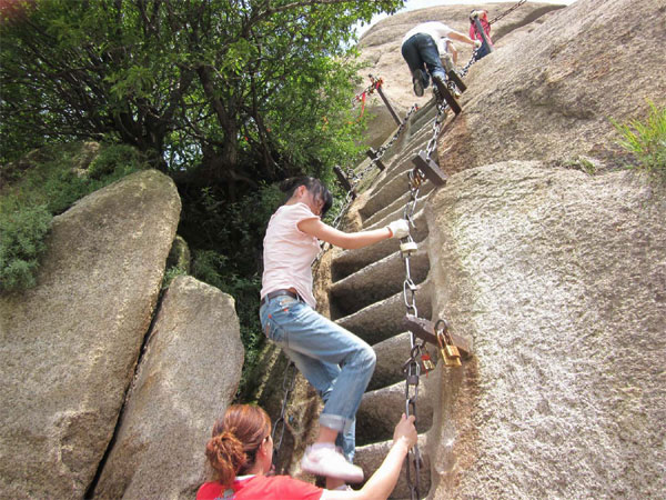 我們每個人都興致勃勃的肩負(fù)著一個大背包,臉上掛著抵擋不住的笑容開始了我們的“征服華山之行”!,雖然經(jīng)過朋友及同事的講解,大家對登山的艱難有了一些初步的了解,我們每個人幾乎都在包包里裝有四瓶以上的水,還有各種吃的東西以及以備御寒的棉衣,負(fù)擔(dān)雖然重,但聽著清泉淙淙聲,望著兩邊青山峻嶺,心情倒也放松了很多。大家都忘記了平日生活的煩惱以及工作的壓力,渾然忘我的欣賞起來,一路歡聲笑語,大家都忘了走了多長時間。剛開始都是緩坡,不陡但很熬人,但因為剛進(jìn)山門,傳說中的華山險道還沒到,大家都是興致盎然,還沒有感覺到有多累。進(jìn)山門走五里就到了五里關(guān),一路上的休息點(diǎn)很多,此時,一看見有休息的地兒,不由自主都想歇歇腳,喝點(diǎn)兒自帶的水,以前從來沒有感覺水是如此的醇美,山谷間送來的陣陣涼風(fēng)讓人愜意,還有一個感覺是熱,是因為連續(xù)登山,渾身大汗,身上的衣服都是濕濕的,一路上偶爾有下山的驢友一瘸一拐地相互攙扶,面露疲態(tài)地擦肩而過。