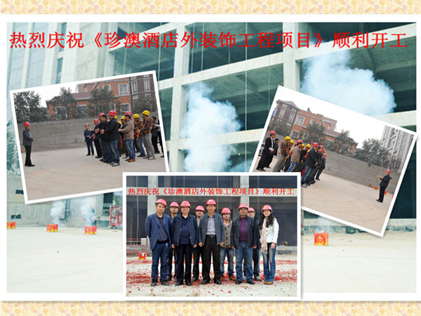 今天很有幸請到了建設方西安珍澳實業(yè)有限公司珍澳酒店外裝飾項目總負責人王總,外裝飾項目技術孫工。施工方西安天幕實業(yè)有限公司董事長吳總,項目負責吳亞軍經理,生產技術負責吳潤全經理,執(zhí)行技術負責劉經理,質量把關樊部長。兩大公司領導及其各相關技術負責人齊聚在長安區(qū)王寺鎮(zhèn),共同迎接一個美好的時刻?!段靼舱浒木频晖庋b飾建設工程施工項目》在此舉行隆重的開工慶典儀式,為本次建設工程揭開完美的序幕。我代表施工方天幕公司向工程的開工表示熱烈的祝賀!對光臨開工儀式的各位領導、各位來賓表示熱烈的歡迎并致以美好的祝愿!