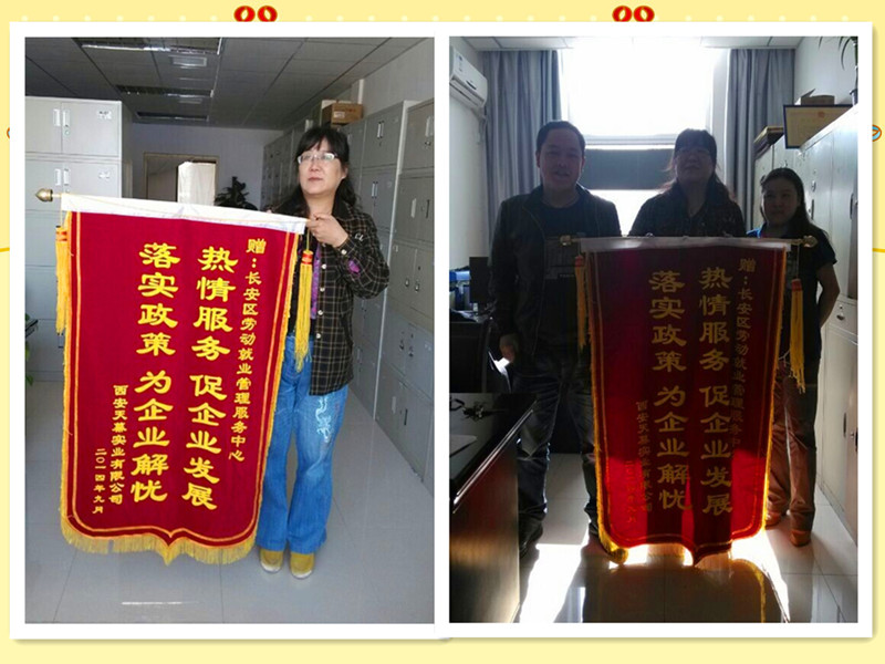 9月30日上午,風(fēng)和日麗,陽光明媚,我和公司的兩位同事一起來到了西安市長安區(qū)勞動就業(yè)管理服務(wù)中心,用雙手送上了我們?yōu)楦兄x該中心制作的錦旗《熱情服務(wù)促企業(yè)發(fā)展,落實政策為企業(yè)解憂》。