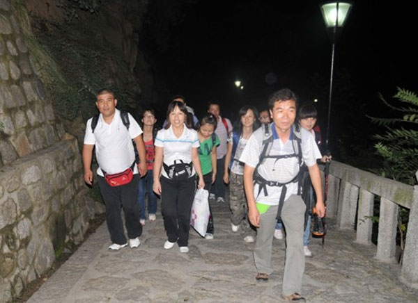 當(dāng)日晚上10點(diǎn),我們的隊(duì)伍來到華山腳下的玉泉苑。在即將登山之前,吳總召集大家開了個(gè)小會(huì),以自己的實(shí)際登山經(jīng)驗(yàn),告誡大家在登山中的注意事項(xiàng),并安排好每個(gè)人的不同職責(zé),質(zhì)檢部樊部長自告奮勇?lián)?dāng)前鋒,大家最后檢查了各自的裝備,群情激昂中開始了我們的華山之行。
