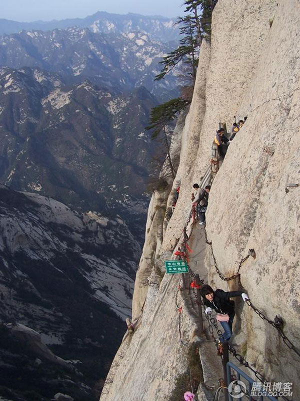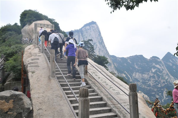 ,連猴子都發(fā)愁,說明崖壁是多么陡峭了。在這兩處,我們第一次領(lǐng)略了華山的“險(xiǎn)”,真所謂舉步艱難。這時(shí),走在前面的樊部長不斷的回頭告誡大家,手要抓穩(wěn),腳要踩實(shí)。吳總也是一次一次鼓勵(lì)大家,堅(jiān)持到底,就是勝利,同時(shí)又將兩個(gè)員工的行李背在了自己肩上。在他們這種精神的感召下,就連我們團(tuán)隊(duì)中年齡最大的王經(jīng)理也不甘示弱,奮勇直上。這時(shí)有個(gè)膽小的女游客發(fā)出驚叫,原來她在回頭看時(shí),對著陡峭的山谷一下恐慌起來,同伴們沒有放棄,一片鼓勵(lì)聲中,伸出堅(jiān)強(qiáng)有力的臂膀推著她,一起越過險(xiǎn)關(guān)。道路雖是艱險(xiǎn),可也讓我們感受到,一步一個(gè)驚喜,一步一次超越。